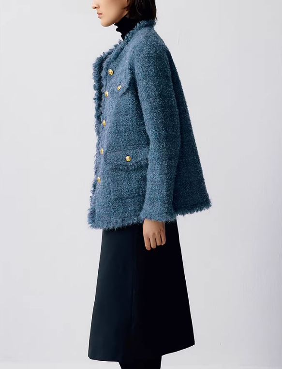 Crafted from premium wool-blend material, the Azure Fringe Coat offers cozy warmth with a soft, plush touch. Carefully brushed wool adds texture and subtle depth to the fabric, while reinforced seams ensure durability. Fringe detailing along the cuffs and hem enhances its tactile charm.
