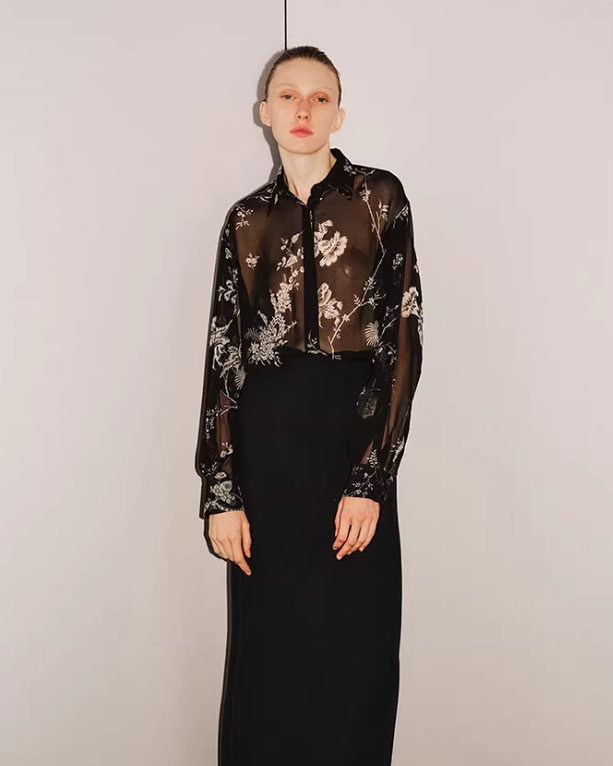 Midnight Vine Sheer draws from nocturnal gardens and the symbolic relationship between darkness and quiet vitality in Eastern philosophy. Botanical forms emerge softly against a dark ground, expressing resilience, mystery, and inner luminosity.