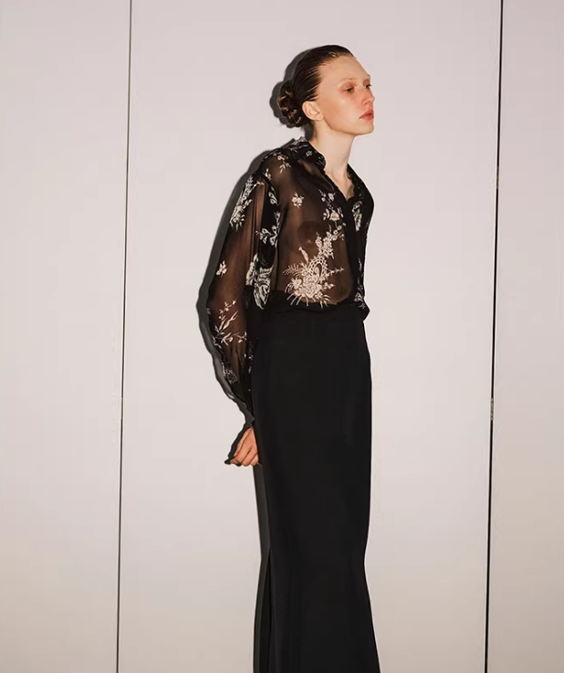 Sheer lightweight chiffon with a fine, smooth surface. Breathable, airy, and designed for layering while maintaining visual depth.