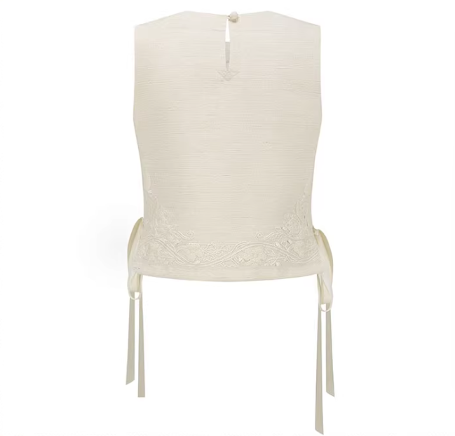 Featuring a slightly relaxed cut, this vest combines classic elegance with artisanal charm. The embroidery is positioned thoughtfully along the neckline and hem, highlighting the natural flow of the fabric. Subtle side slits enhance movement and add to the vest’s graceful silhouette.